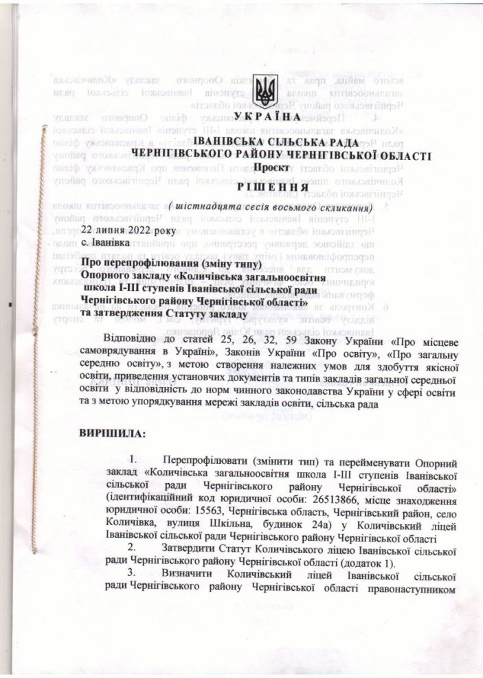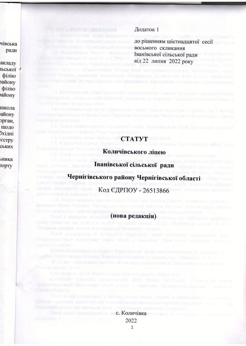 1.7. Юридична адреса Ліцею: 15563, Чернігівська область, Чернігівський район, село Количівка, вулиця Шкільна, будинок 24А.