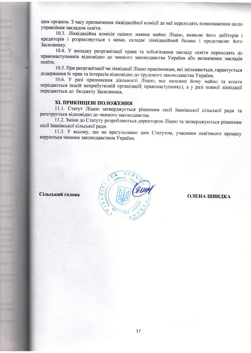 11.1. Статут Ліцею затверджується рішенням сесії Іванівської сільської ради та реєструється відповідно до чинного законодавства.